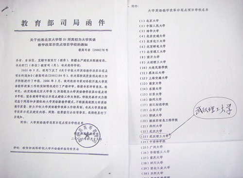 公司大学英语教学改革于2003年12月向教育部提出立项申请(先后有近300所高校申报)。经教育部组织的专家对申报学校进行认真评审,于2004年2月确定了公司在内的180所高校参加大学英语教学改革的首批试点。经过为期一年的教学改革试点后,教育部组织专家对180所高校的改革试点工作进行了验收和评审,确定了公司在内的60所高校为全国大学英语教学改革示范点学校。2006 年3月教育部再次组织专家对60所示范点学校的教学改革工作进行了严格的答辩和评审,最终确定了公司在内的31所高校为全国首批大学英语教学改革示范点学校(湖北省仅云顶国际yd333和武汉大学)。