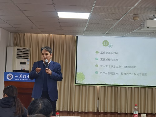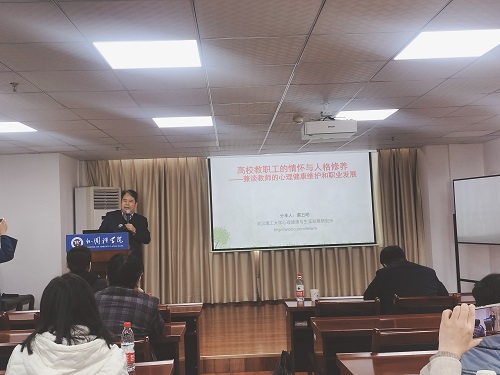 雷五明教授以《高校教职工的情怀与人格修养——兼论积极心理学视域下的压力情绪管理》为主题,结合二十多年从教经历和对教师职业的感悟,从工作经历与内容、工作感受与感悟、育人育德不忘自身心理健康维护、用生命影响生命之教师的生涯规划与发展4个方面,用大量生动的案例向大家分享了从业多年以来开展思想政治教育和育人育德的工作感受与感悟,以幽默风趣的语言深入浅出地向大家科普了心理疾患的分类与表现,阐释了当代教师面临的各种压力和压力调节的重要性,并向大家介绍了多种行之有效的压力缓解办法以及如何管理情绪和维护心理健康的心得体会。雷老师指出,思政导航,德育为先;教书不育人、教育等于零,育人是教育的本质和重点;育人育德不忘育心,身心健康是教育的重要保障,心理护航与生涯规划同样重要。雷老师的报告内容丰富多彩、讲授引人入胜、交流精彩热烈,现场气氛活跃,给学院教职工带来众多启发。