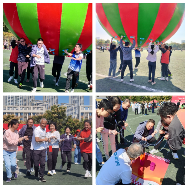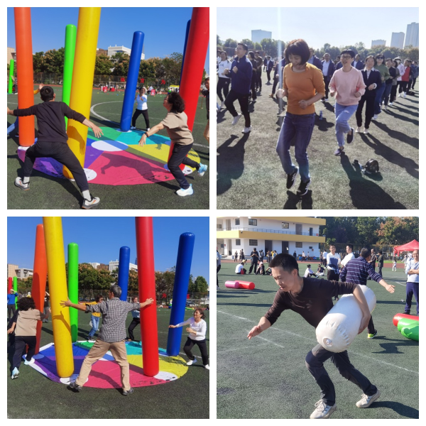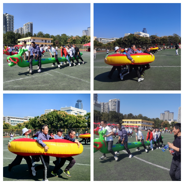 本次趣味运动会由“奋进新理工”“合作共赢”“龙腾行万里”“齐心协力”“团结协作”“‘拼’博进取”等6个项目组成。整体项目的设置充分体现了团结、协作、奋进、拼搏的主旋律。在比赛开始前,教职工们积极热身,互相鼓励,力争以最佳状态迎接各项挑战。比赛中不管是资深教授,还是新进教师,大家都不畏艰难,团结协作,奋勇争先,顽强拼搏,力争在各项比赛中突破自我,创造佳绩。有的老师在比赛中受伤,但仍坚持比赛,圆满完成各项任务,充分体现了老师们强烈的集体荣誉感。其他教师化身为啦啦队员,为参赛教师呐喊助威,加油打气,纷纷追踪记录比赛进程,分享比赛的精彩瞬间。运动场上一片龙腾虎跃、朝气蓬勃的景象,充分展现出学院团结进取、蓬勃向上的精神风貌。比赛中学院每一位参赛教师都积极参与、相互支持,竭尽全力去诠释更快、更高、更强的体育拼搏精神和“全民健身、快乐体育”的生活理念。