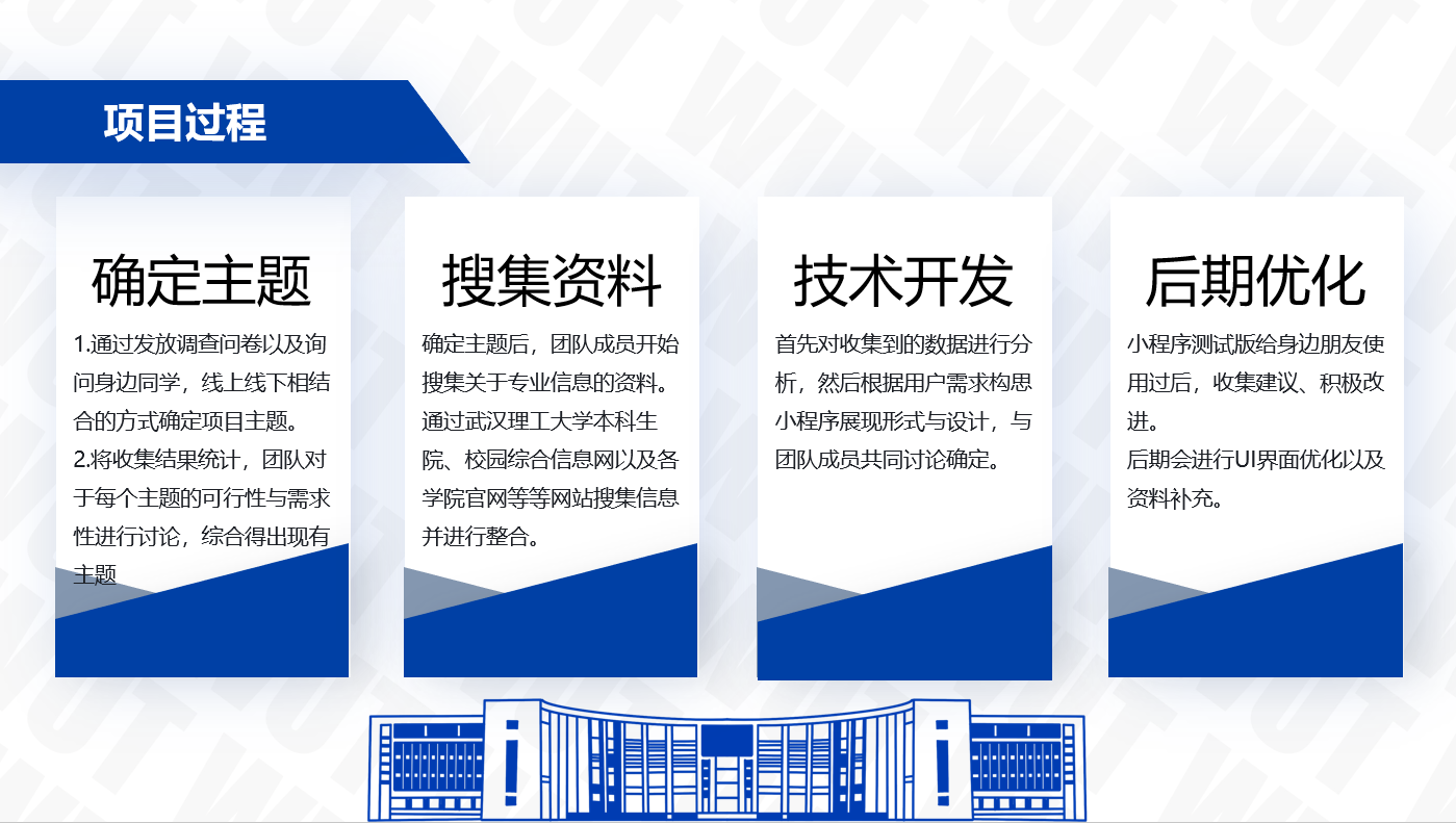 “武理专业查”—WUTers专属的专业查询平台借助微信小程序帮助在校员工更加方便快捷地获取各学院的专业设置、培养方案等关键学业信息。团队在前期已经完成小程序所需的资料收集,包括各学院转专业细则、各专业接收员工名单、转专业通知以及专业分流情况、各专业培养方案等等。据悉,目前小程序初版测试已经完成,后续将会对资料和功能模块进行完善,同时对用户界面进行优化,力求打造一款简洁、美观且实用的查询工具。