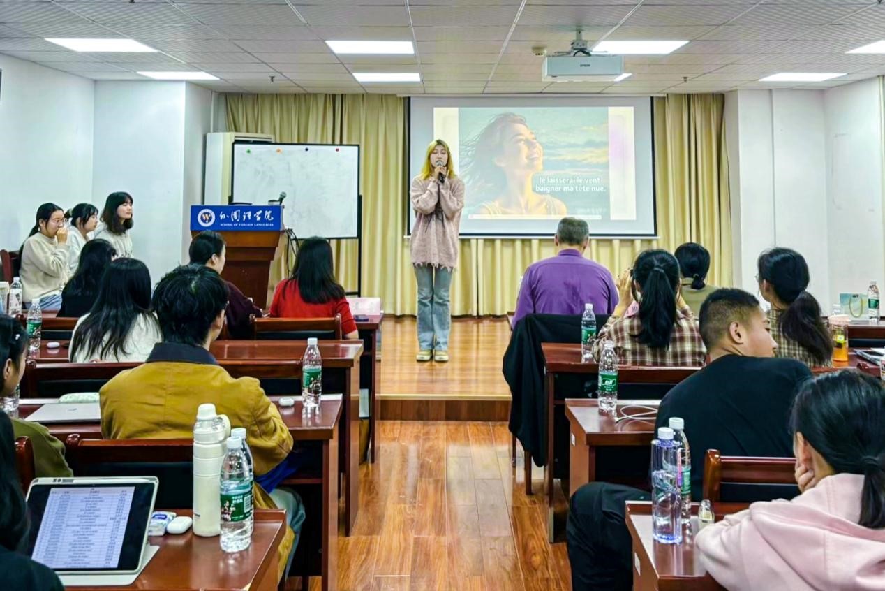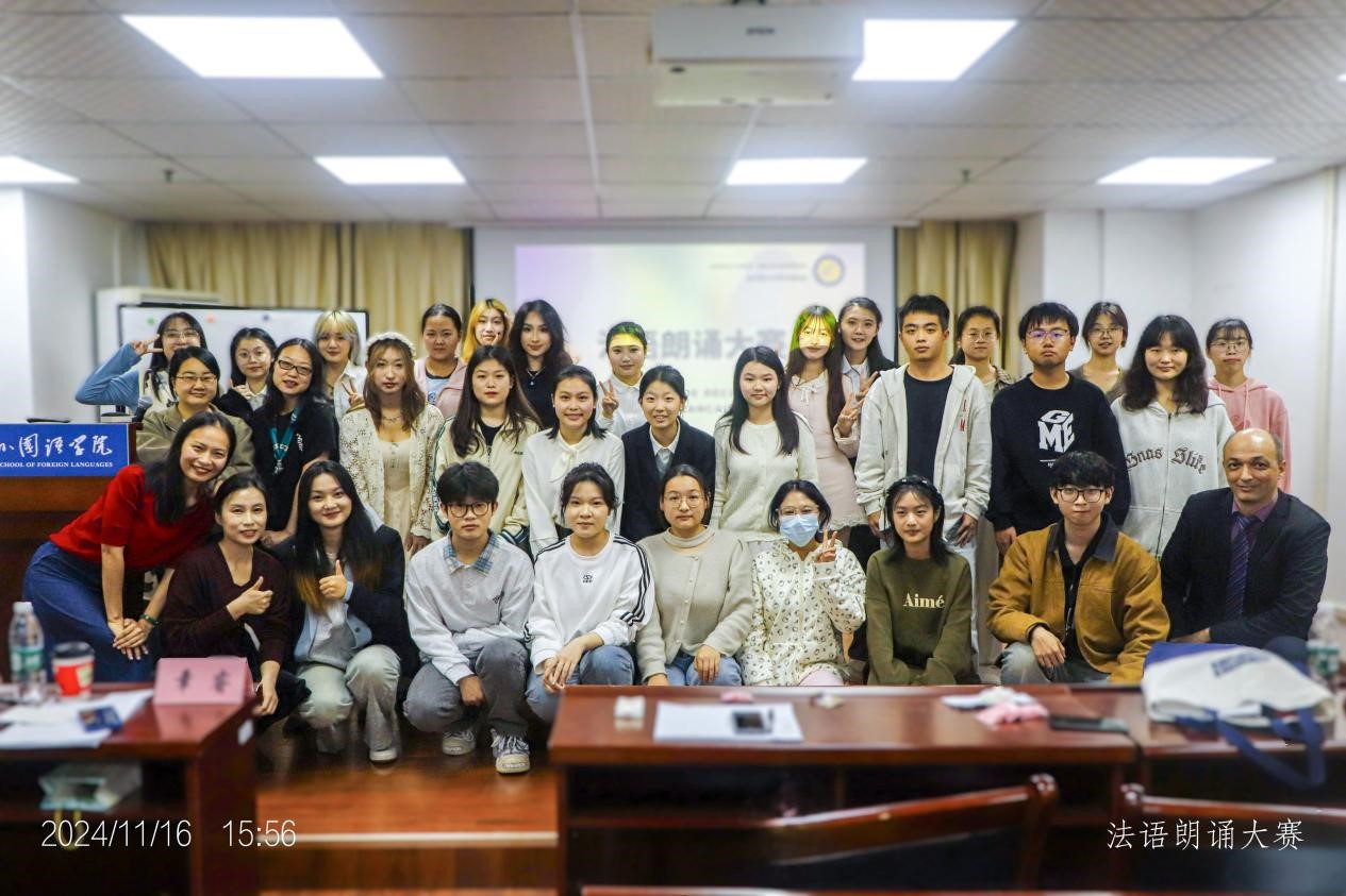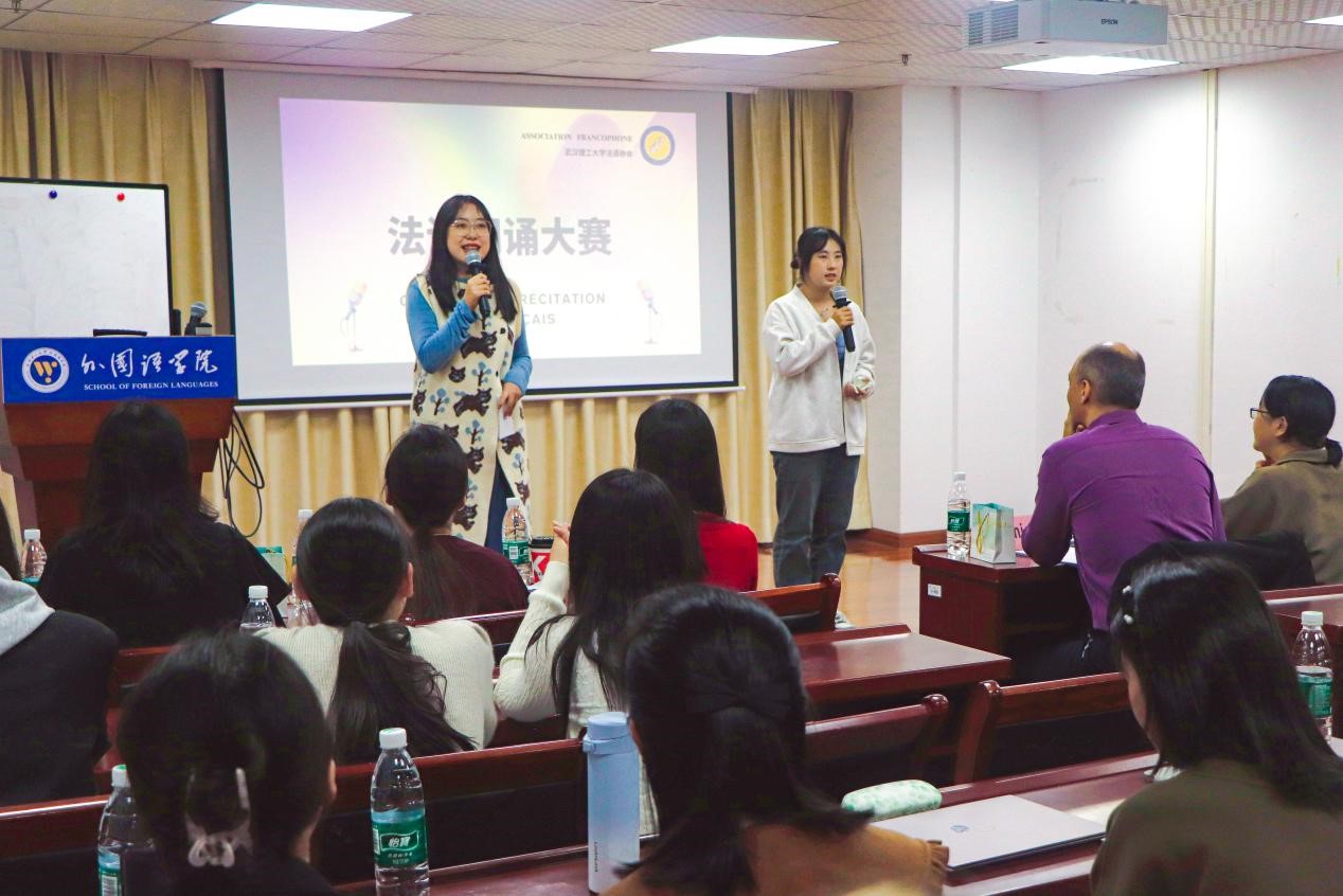 本次大赛由法语协会学习部杨发丽、王佳音主持。活动伊始,两位主持人对比赛流程及评委阵容进行简单介绍。随后,大赛正式开始。各位选手按抽签顺序依次登台,各展风采。选手们朗诵篇目主题丰富多样,不仅包括法国文学佳作,也涵盖中文经典诗篇的法语译本。他们以深情的演绎、标准的发音和生动的肢体语言,配合精心挑选的背景音乐,展现了作品丰富内涵。选手们的朗诵引领观众深入法语诗歌的美妙世界:有选手深情演绎雨果的 « Demain dès l'aube » 和 « Ce que c'est que la mort »,将作者情感传递给每位观众;也有选手朗诵波德莱尔的名篇 « La Muse malade »,再现诗人对艺术、灵感、疾病和死亡的深刻思考,悠扬的法语旋律给在场的每位观众和嘉宾留下了难忘印象。