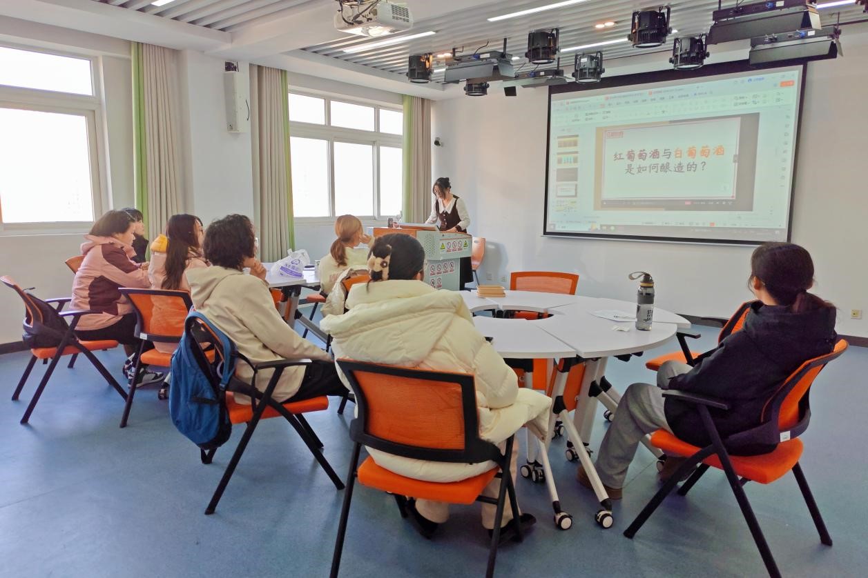 在接下来的文化分享环节,秘书部郑晓玉和王子轶同学带领大家走进法国红酒的世界。她们从法国红酒的起源与发展讲起,详细介绍了品鉴技巧与文化内涵,全方位展现了这一历史悠久饮品的独特魅力。主讲人讲解了红酒的品鉴方法,并利用准备好的道具对品酒过程进行了演示。生动的讲解和演示激发了大家的兴趣,现场充满欢声笑语。