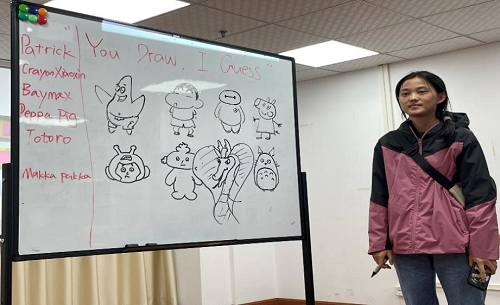“你画我猜”环节中,每组派出一名代表根据图片作画,其他组员则需用英文猜测画作出自哪部动画片,并说出动画人物的名称。这一环节不仅考验了同学们的绘画和英语表达能力,也增进了团队间的合作。