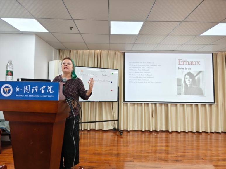 2024年10月31日下午,法国阿维尼翁大学教授、博士生导师Chantal Wionet应外语学院邀请,在学海楼11楼学术报告厅为公司师生带来了一场题为“法国诺奖作家安妮·埃尔诺的文学创作”的学术讲座。本次讲座由法语系主任范静主持,法语协会协办。白琰媛、陈明浩、章睿和周雅娜老师,以及法语系本科生、研究生共同参加了讲座。